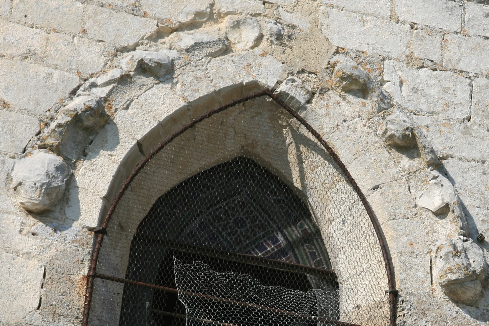 - l'arc au dessus des fenêtres de chœur décoré par ces mêmes motifs de fleurs séparées, reposant sur deux têtes